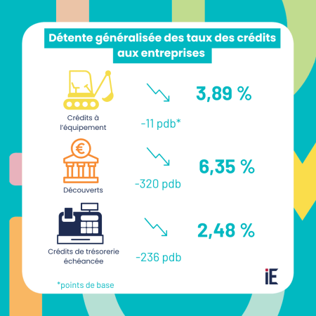 - Suivant la même tendance, le taux moyen des crédits de trésorerie échéancée s’affaiblit de 236 pdb sur le trimestre (-201 pdb sur un an). À 2,48 %, il est nettement inférieur au taux moyen national (3,62 %).