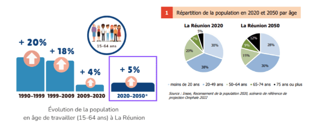 Le vieillissement de la population réunionnaise aura un impact direct sur le marché du travail. La population en âge de travailler (15-64 ans) n’augmentera que de 5 % d’ici 2050, de 564 000 à 594 000 personnes. Entre 1990 et 2009, la population en âge de travailler avait augmenté de 20 % par décennie, avant de ralentir à +4 % entre 2009 et 2020. Cette progression limitée, bien inférieure à celle de la population totale (+15 %), devrait réduire la pression démographique sur le marché du travail. Toutefois, la part de la population active dans la population totale devrait diminuer.