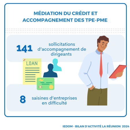En 2024, le correspondant TPE-PME de l’IEDOM a reçu 141 demandes relevant de problématiques liées aux difficultés de trésorerie et aux besoins d’accompagnement à la création d’entreprise contre 228 en 2023. L’essentiel des structures orientées a peu d’effectif, réalise un chiffre d’affaires inférieur à 200 K€ et appartient aux secteurs du commerce et de l’artisanat. L’IEDOM a participé aux différents événements organisés par les réseaux d’accompagnement des entreprises : les campagnes de microcrédit de l’ADIE en février, mai et juin, le Forum territorialisé de l’action sociale et de l’insertion professionnelle du Département en mai, l’entrepreneuriat féminin de la CCIR en juin ou encore la journée de l’innovation entrepreneuriale en octobre.