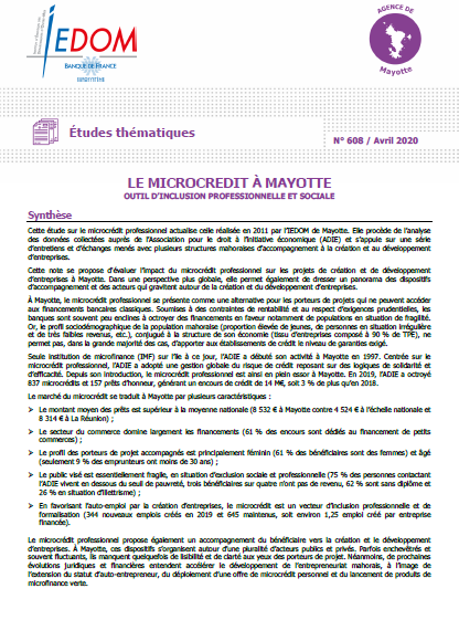 Cette étude sur le microcrédit professionnel actualise celle réalisée en 2011 par l’IEDOM de Mayotte.