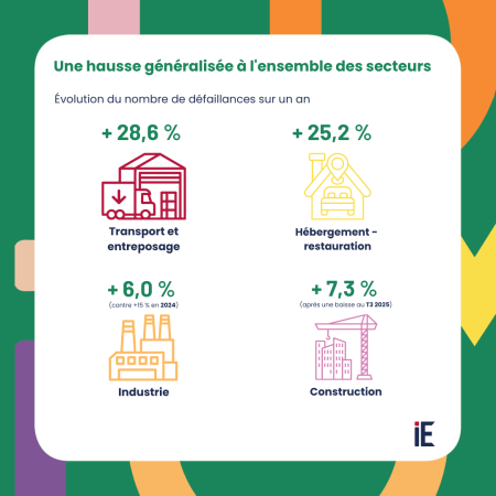 Cinq secteurs d’activité présentent des hausses du nombre de défaillances supérieures à 10 %. Les plus affectés étant le transport et entreposage (+28,6 %), l’hébergement-restauration (+25,2 %) et les conseils et services aux entreprises (+24,6 % sur un an).