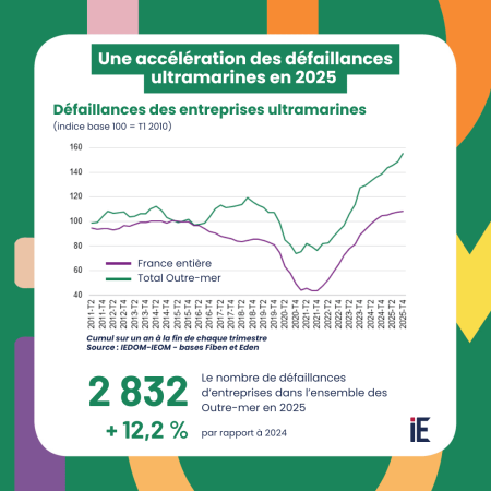En 2025, 2 832 redressements et liquidations judiciaires d’entreprises ont été enregistrés en Outre-mer. Alors que les économies ultramarines affichaient une croissance plus modérée du nombre de défaillances en 2024 par rapport à l’Hexagone, la tendance s’inverse sensiblement en 2025 avec une progression des défaillances de 12,2 % en rythme annuel contre 3,5 % pour la France entière.