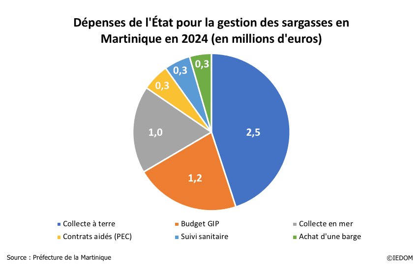 Afin d’accompagner les collectivités locales, l’État s’est saisi du sujet en mettant en place des plans Sargasses depuis 2018. Le plan Sargasses II (2022-2025), doté d’un budget de 36 millions d’euros sur quatre ans pour la Martinique, la Guadeloupe et les îles du Nord, a notamment été consacré à l’installation et la gestion de barrages, la collecte, le stockage, la valorisation et la conduite d’études d’impact environnemental et sanitaire. Au-delà des fonds mobilisés, le plan a permis la création d’un Groupement d’Intérêt Public (GIP) en Martinique et d’un syndicat de gestion en Guadeloupe. Le GIP a vocation à coordonner les différents moyens mis en place dans la lutte contre les sargasses (collecte en mer, achat d’équipement, etc.). Un nouveau plan, Sargasses III, devrait être adopté prochainement.