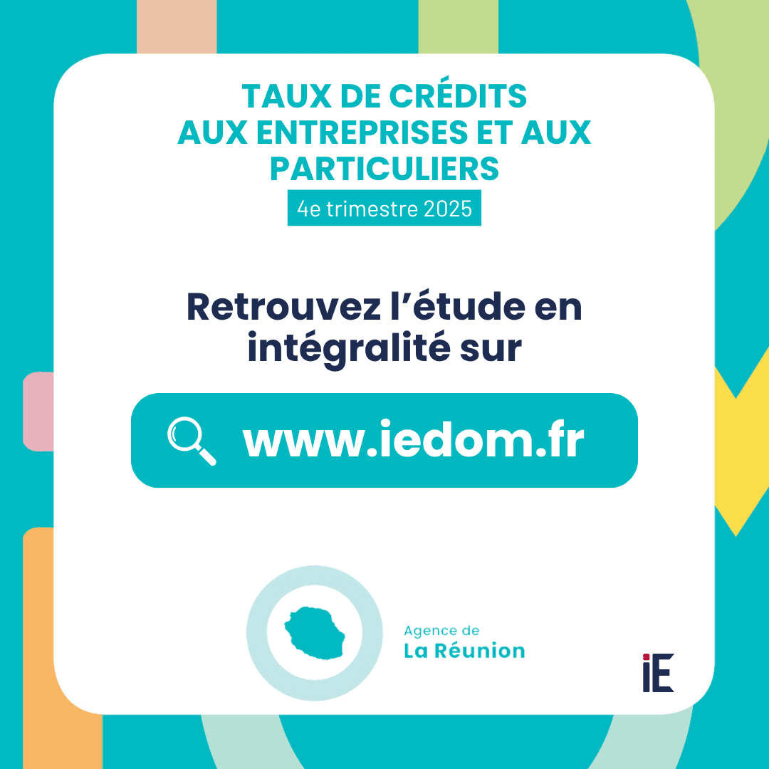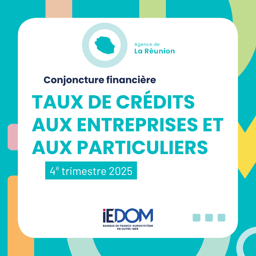 Le taux moyen des nouveaux crédits à l’habitat baisse au 4e trimestre 2025 et repasse ainsi en deçà du niveau national pour la première fois depuis 2 ans. Il s’établit à 2,82 % à La Réunion, contre 2,99 % au niveau national. La durée moyenne des prêts à l’habitat atteint 21 ans, pour un montant moyen d’emprunt d’environ 147 000 euros. Le taux moyen des nouveaux crédits échéancés à la consommation augmente légèrement, pour s’établir à 6,17 %. La durée moyenne des prêts personnels est d’un peu plus de 5 ans, pour un montant moyen de 17 100 euros.