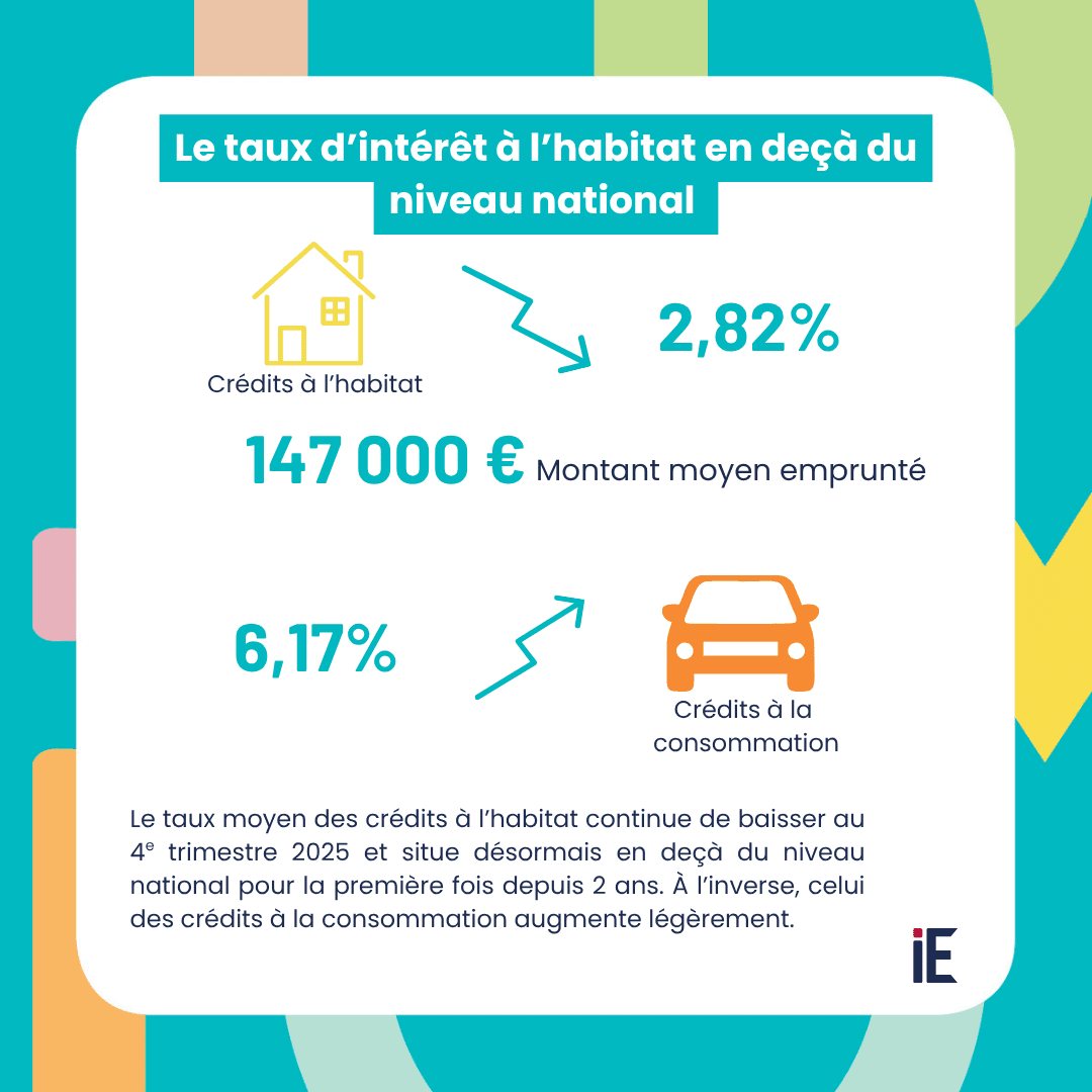 Dans l’ensemble, les taux d’intérêt poursuivent leur baisse. Côté particulier, le taux moyen des crédits à l’habitat continue de baisser au 4e trimestre 2025 et situe désormais en deçà du niveau national pour la première fois depuis 2 ans. Côté entreprises Le taux d’intérêt moyen des crédits de trésorerie aux entreprises baisse et demeure au-dessous du niveau national. Les taux des crédits à l’équipement et à l’immobilier reculent également, après une pause au trimestre dernier.