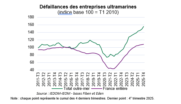 L’IEDOM et l’IEOM publient les statistiques actualisées des défaillances d’entreprises relatives à l’ensemble des territoires ultramarins. En 2025, 2 832 redressements et liquidations judiciaires d’entreprises ont été enregistrés en Outre-mer. Alors que les économies ultramarines affichaient une croissance plus modérée du nombre de défaillances en 2024 par rapport à l’Hexagone, la tendance s’inverse sensiblement en 2025 avec une progression des défaillances de 12,2 % en rythme annuel contre 3,5 % pour la France entière.