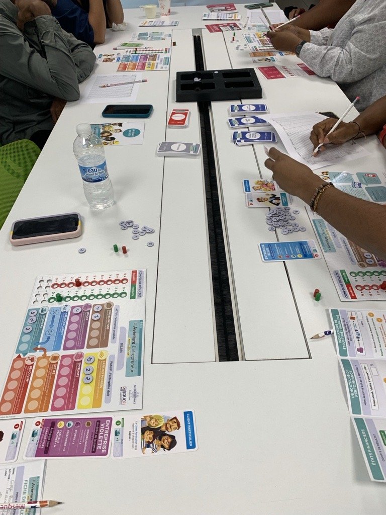 L’autre, l’après-midi, pendant laquelle le correspondant EDUCFI et TMPE, Hervé Louis-Jean a animé 4 parties simultanées de jeu #aventure-entrepreneur avec l’aide de 2 personnes de Martinique Développement et du réseau LILAS. Les participants ont beaucoup apprécié le jeu à tel point que plusieurs accompagnateurs ont souhaité récupérer immédiatement des boites de jeu.