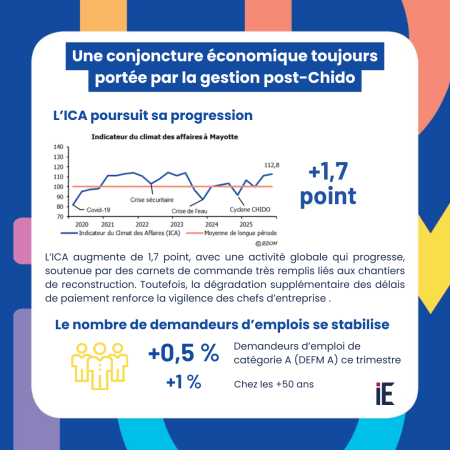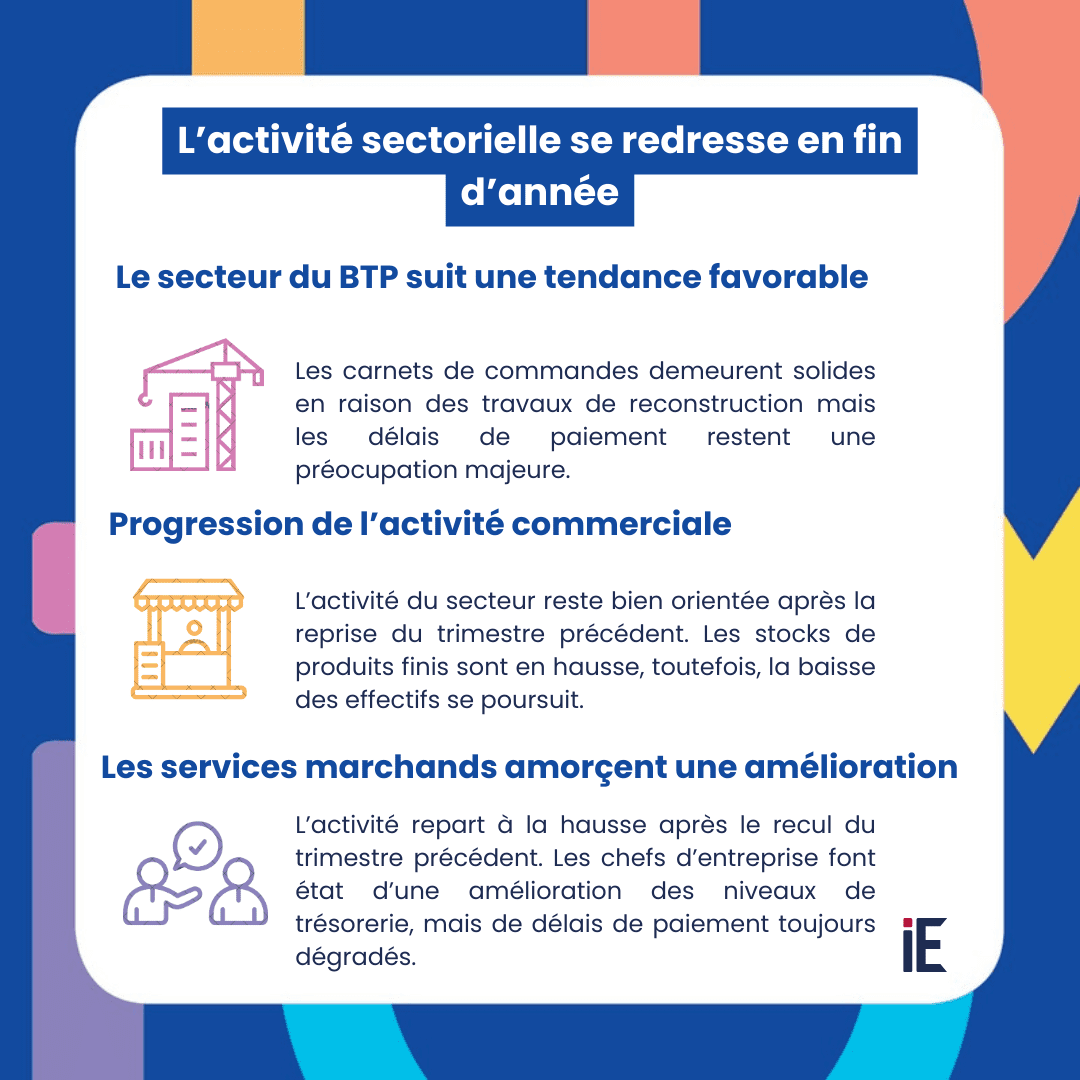 L’Indicateur du climat des affaires (ICA) est hausse de 1,7 point et se positionne à 112,8. Le niveau des trésoreries continue de se dégrader bien que cette tendance tende à se réduire. Si les délais de paiements se raccourcissent, cette évolution semble ne pas forcément traduire une amélioration intrinsèque de la santé financière des entreprises mais plutôt un climat de méfiance accru entre les opérateurs.