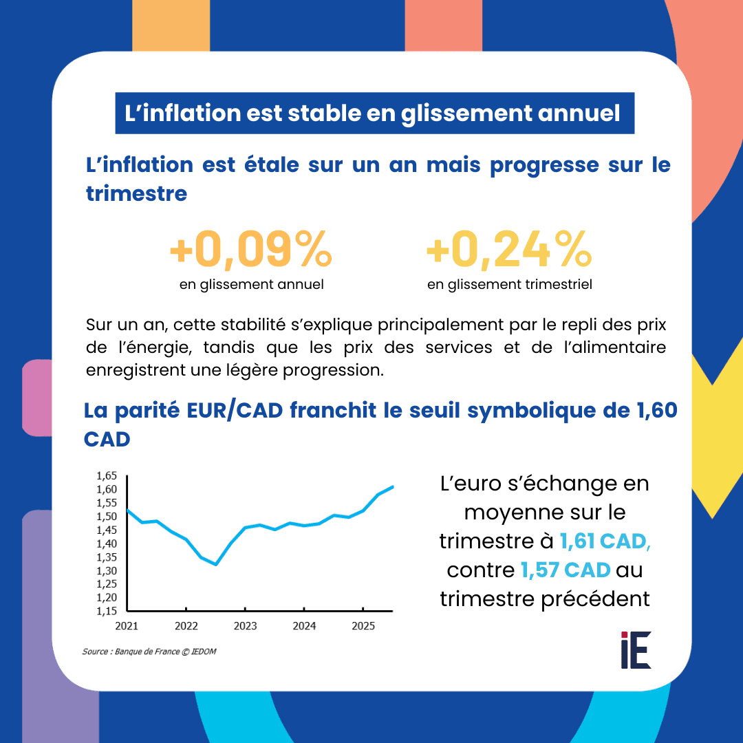 Au troisième trimestre 2025, l’économie de Saint-Pierre-et-Miquelon présente un bilan contrasté. L’inflation demeure stable sur un an, à rebours des hausses observées en France (+1,1 %) et au Canada (+2,0 %).