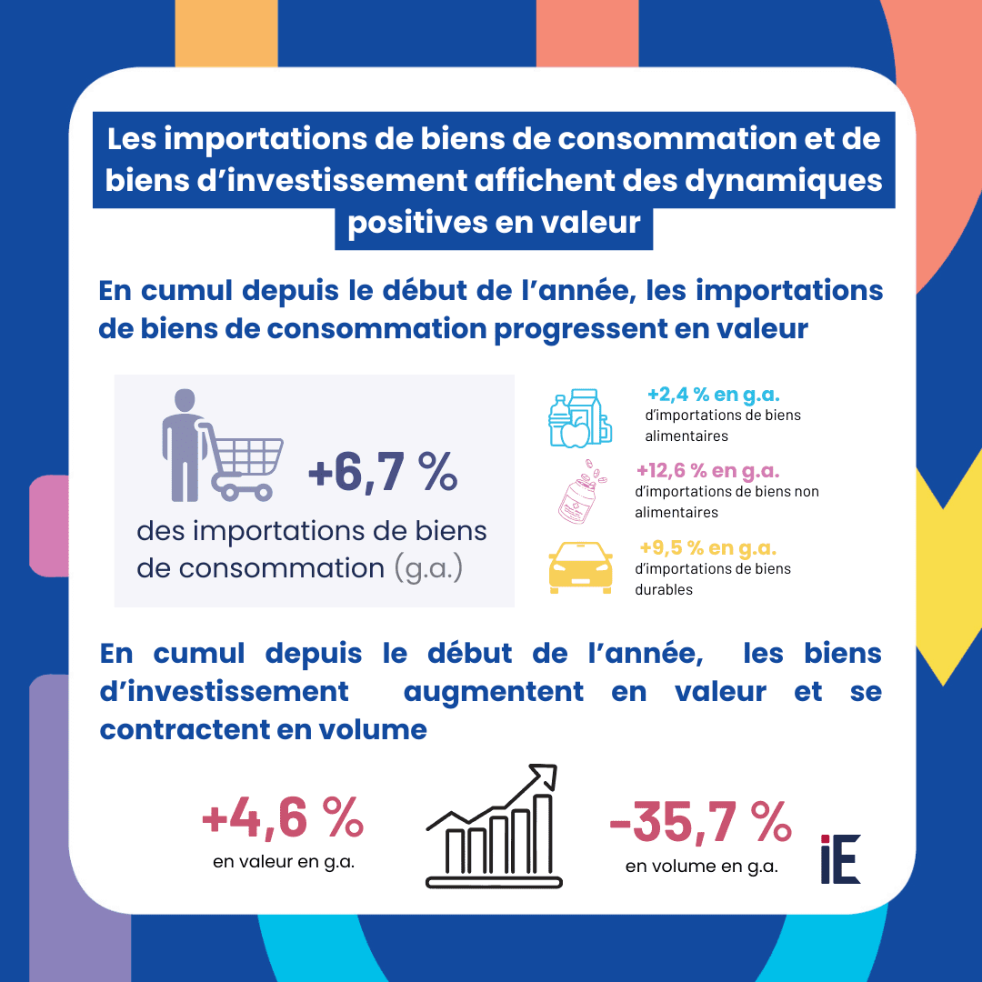 Dans ce contexte, en cumul depuis le début de l’année, la consommation des ménages poursuit sa progression en valeur (+6,7 % en g.a) mais recule en volume (-1,6 % en g.a), une dynamique également observée pour les biens d’investissement, dont la forte baisse en volume (-35,7 % en g.a) s’explique par l’effet de base des importations exceptionnelles de roches en 2024.