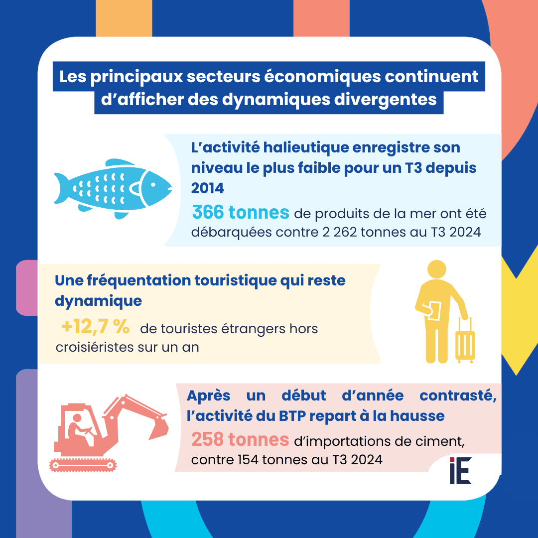 Sur le plan sectoriel, la pêche atteint son plus bas niveau pour un troisième trimestre depuis 2014 (-83,8 % en g.a) sous l’effet des tensions tarifaires avec le Canada, tandis que le tourisme confirme sa bonne orientation avec une fréquentation hors croisiéristes record sur neuf mois. Enfin, le secteur du BTP retrouve du dynamisme, principalement portée par des travaux de rénovation de bâtiments et la reconstruction des stations de refoulement.
